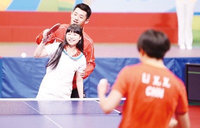 8月28日,在香港伊利沙伯体育馆乒乓球运动员张继科(后)指导粉丝与李晓霞“对决”。(新华社记者 秦晴/摄)