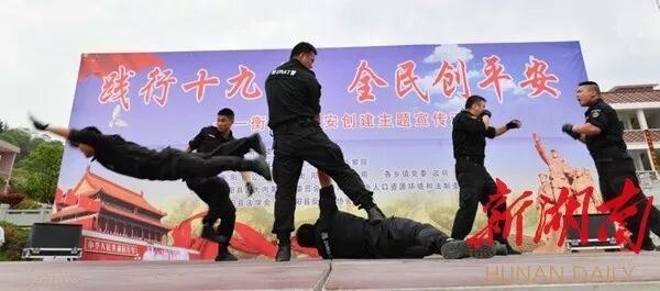 4月11日,正是衡阳县界牌镇赶集的日子。下午2时30分,该镇银瓷完小校园里人头攒动,热闹非凡。县里组织的“践行十九大、全民创平安”送法下乡活动正在演出。