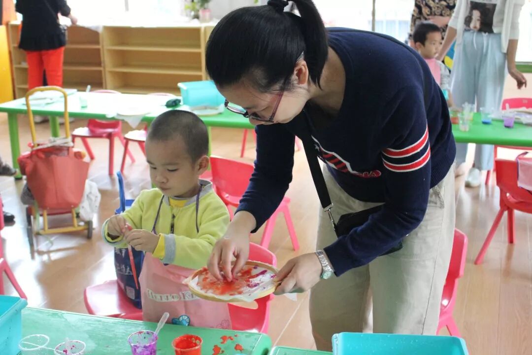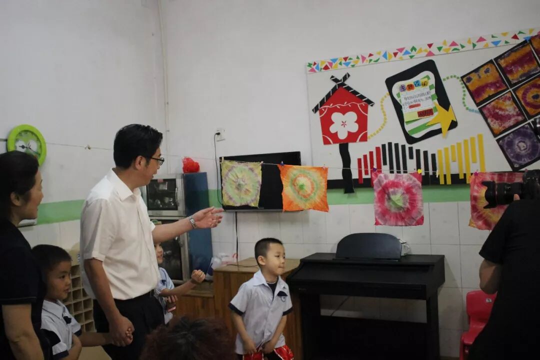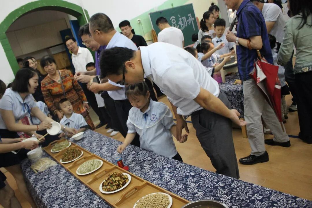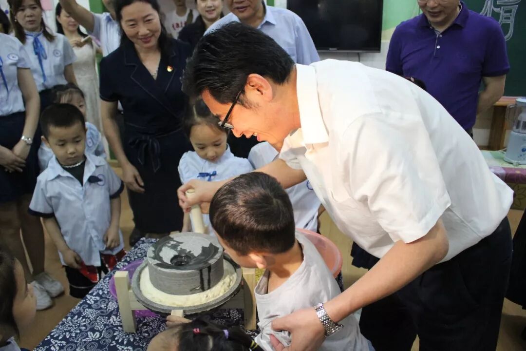 随后,在中心主任宋丽琼的带领下,领导一行步入室内参观传统文化场馆。情“豆”初开馆里,邓市长握着小朋友的手兴致勃勃地磨豆子,品尝热情的孩子送过来的豆制美食;来到玩转皮影馆,饶有兴致地观看师生共同创作的精彩表演;在艺染绽放馆,和孩子们亲切交谈,并为正在晾干的亲子作品点赞。经过走廊时,看到文化墙上展示的“亲子诵读·我为古诗配图文”画展,领导们纷纷为活动中心倡导家庭教育、传承中华文化的教育理念表示赞赏与肯定。