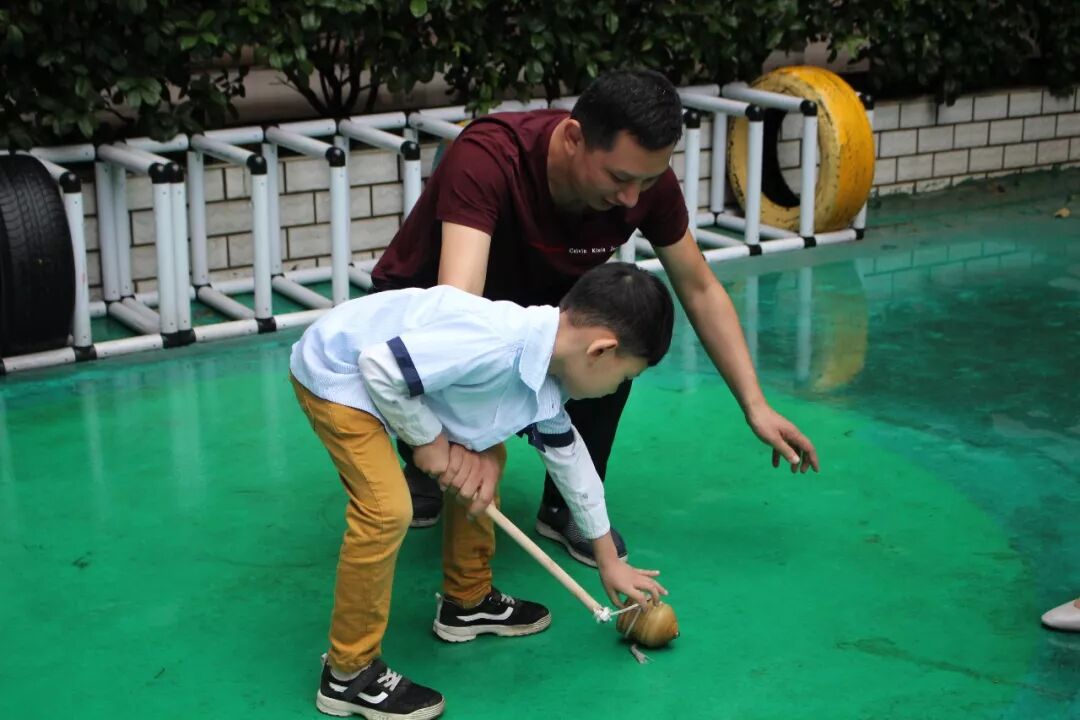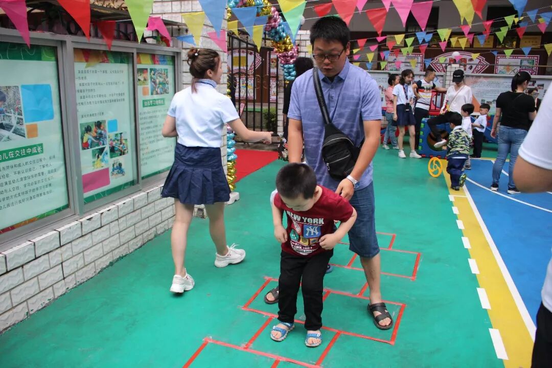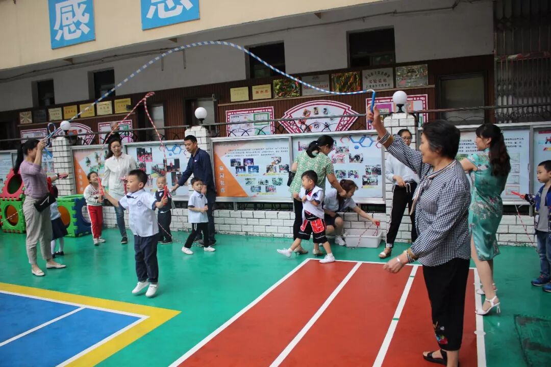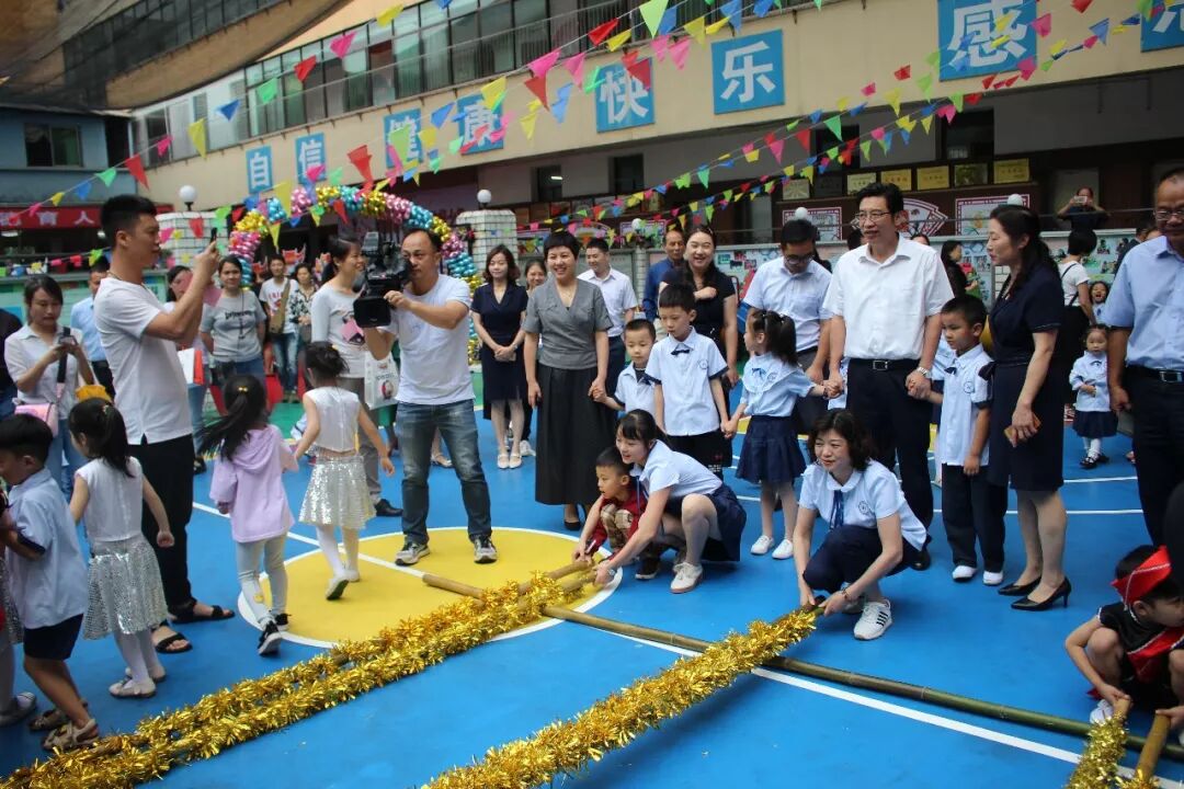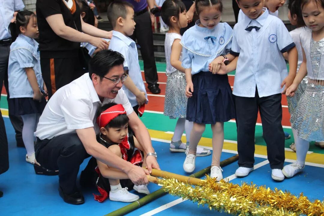 一进大门,篮球场上的民间游戏就深深吸引了童心未泯的领导们,他们兴致勃勃地观看竹竿舞的玩法,并蹲下来一起体验敲竹竿,看到孩子轻松地从竹竿里跳跃,开怀大笑。