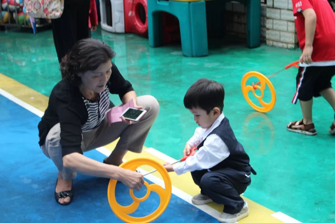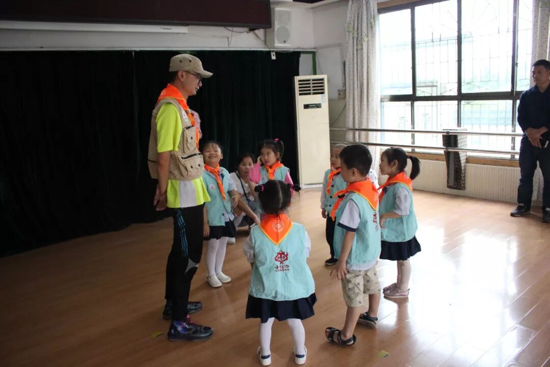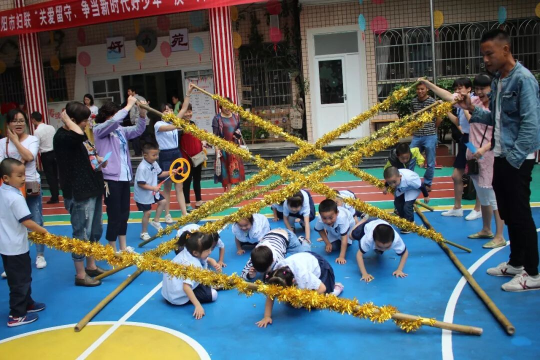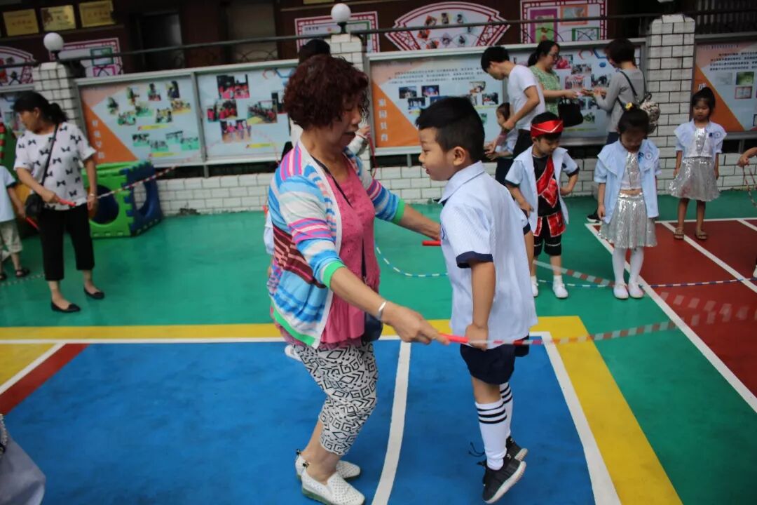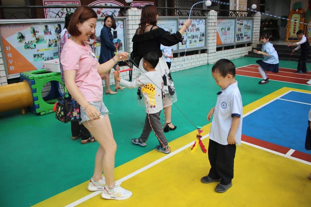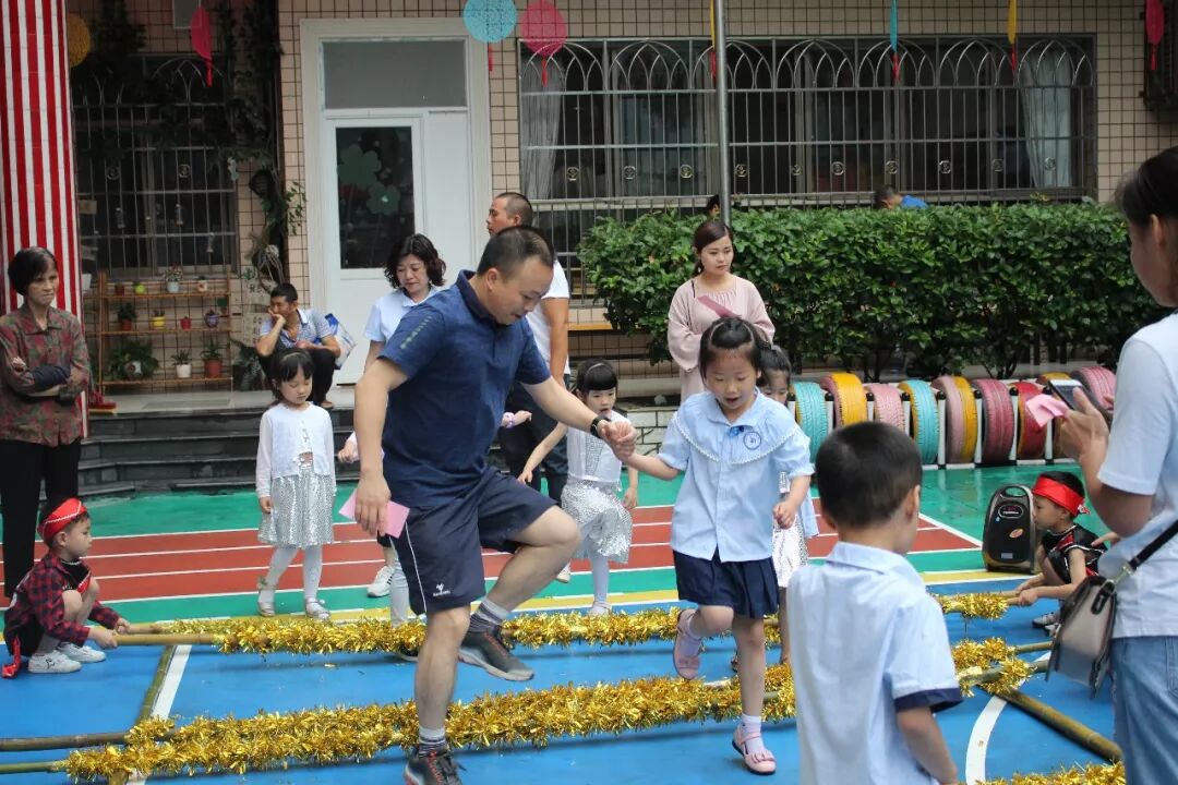 一进大门,篮球场上的民间游戏就深深吸引了童心未泯的领导们,他们兴致勃勃地观看竹竿舞的玩法,并蹲下来一起体验敲竹竿,看到孩子轻松地从竹竿里跳跃,开怀大笑。