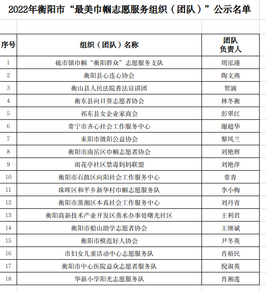 为深入学习贯彻习近平总书记关于志愿服务的重要指示精神,深入开展“衡阳群众”品牌创建活动,大力弘扬“奉献、友爱、互助、进步”的志愿精神,充分发挥学雷锋志愿服务典型的示范引领作用,根据衡阳市妇联《关于开展寻找“最美巾帼志愿者”“最美巾帼志愿服务组织(团队) ”活动的通知》要求,通过层层发动、逐级推荐、现场考察、征求有关部门意见、研究审核,拟推荐2022年衡阳市“最美巾帼志愿者”22名、衡阳市“最美巾帼志愿服务组织(团队)”18个,现将名单予以公示。